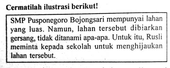 D. Mungkin di Kabupaten ini, sekolah kamilah yang mempunyai lahan begitu luas. Lahan tersebut dapat dimanfaatkan untuk praktik anak-anak, misalnya menanam tumbuhan/pohon tertentu.