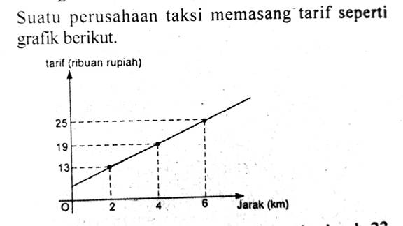 Alia pergi kerumah nenek yang berjarak 22 kilometer dengan menggunakan takso tersebut. Berapa tarif taksi yang harus dibayar Alia?