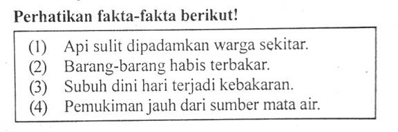 D. Kawasan pemukiman terbakar. Subuh dini hari kompor gas meledak. Api sulit dipaamkan karena lokasi jauh dari sumber mata air. Barang-barang seisi rumah yang kosong penghuni tak terselamatkan dari kobaran api.